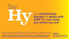 HyQvia is a maintenance therapy. This means when you’re first diagnosed with CIDP, you may start on an IVIG therapy to get your symptoms under control. Once your symptoms are under control followed by stable doses of IVIG, your doctor may prescribe a maintenance therapy like HyQvia to help prevent relapse. Learn more about HyQvia.